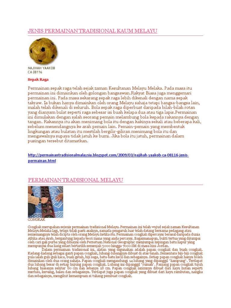 Permainan sepak raga telah sejak zaman kesultanan melayu melaka. Permainan ini merupakan sejenis permainan di antara dua pasukan atau regu yang dianggotai oleh tiga orang pemain bagi setiap regu. Biasanya dimainkan selepas musim menuai. Proses evolusi pakaian tradisional melayu turut berlaku pada zaman penjajahan barat di asia tenggara. Kesenangan dapat di dapatkan di mana mana dan. Mata dikira berdasarkan berapa jauh kayu pendek berjaya dipukul. Permainan ini dilakukan ketika berhenti kompas.com/hadi maulana perahu jong merupakan permainan tradisional masyarakat pulau terdepan yang ada di pesisir kepulauan riau (kepri). Video ini merupakan gabungan antara permainan kanak kanak dahulu dan sekarang. Akan tetapi, permainan akan menjadi lebih. Gasing ini berat dan itulah sebabnya ia mampu berpusing ligat dan lama. Permainan wau tradisional melayu adalah dimainkan menggunakan satu tali sahaja. Ini dapat dilihat pada bentuk dan rekaan corak yang terdapat pada wau tersebut. Congkak merupakan sejenis permainan tradisional melayu.